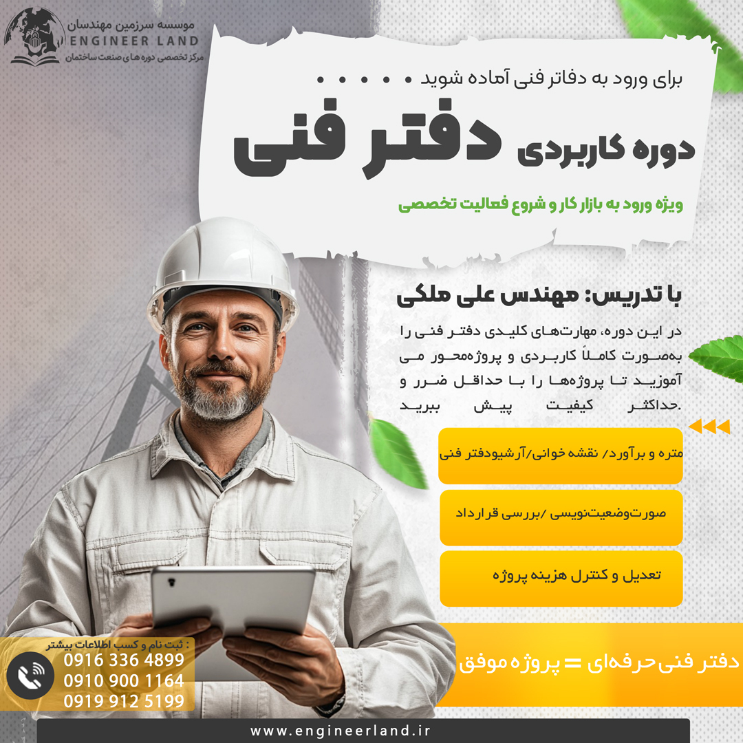 دفتر فنی ویژه ورود به بازار کار و شروع فعالیت تخصصی دوره جامع دفتر فنی پروژههای عمرانی در این دوره، مهارتهای کلیدی دفتر فنی را بهصورت کاملاً کاربردی و پروژهمحور میآموزید تا پروژهها را با حداقل ضرر و حداکثر کیفیت پیش ببرید. متره و برآورد، نقشهخوانی و صورتوضعیتنویسی بررسی قراردادها، تعدیل و کنترل هزینه پروژه آموزش عملی بر اساس پروژههای واقعی بازار کار دفتر فنی حرفهای = پروژه موفق